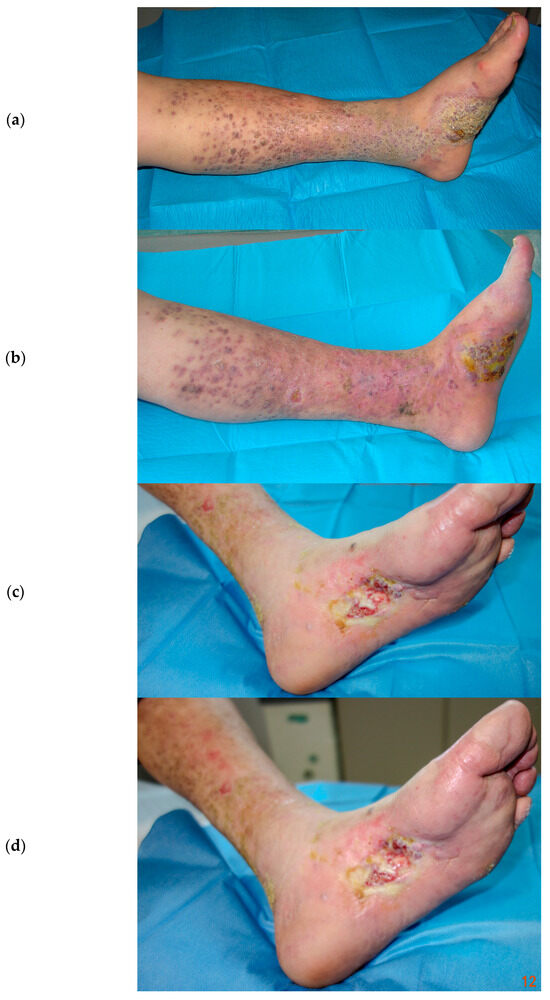 (a,b) Widespread plaques and nodules on the leg and foot. (c) Complete remission of healed nodules and plaques with residual hyperpigmentation and hypotrophic scars. (d) Partial remission of treated lesion with residual nodule.