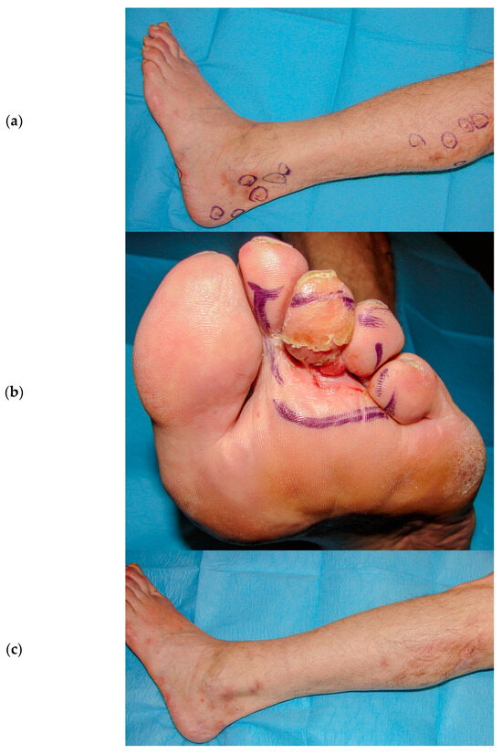 - Brambilla, L.; Genovese, G.; Berti, E.; Peris, K.; Rongioletti, F.; Micali, G.; Ayala, F.; DELLA Bella, S.; Mancuso, R.; Pinton, P.C.; et al. Diagnosis and treatment of classic and iatrogenic Kaposi’s sarcoma: Italian recommendations. Ital. J. Dermatol. Venerol. 2021, 156, 356–365. [Google Scholar] [CrossRef]