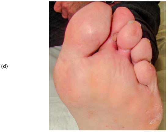 (a) Left leg widespread skin and subcutaneous Kaposi lesions in a 63-year-old patient. Before ECT treatment. (b) After three ECT treatments with systemic Bleomycin. (c,d) Local control of the disease after 3 years and 4 years follow-up, respectively.