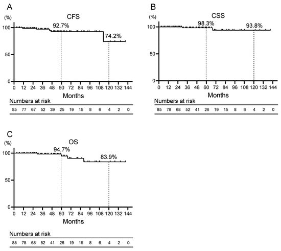 Kaplan–Meier curves for (A) castration-resistant prostate cancer progression-free survival (CFS), (B) cancer-specific survival (CSS), and (C) overall survival (OS) of patients with prostate cancer who received salvage androgen deprivation therapy for recurrence after robot-assisted radical prostatectomy.