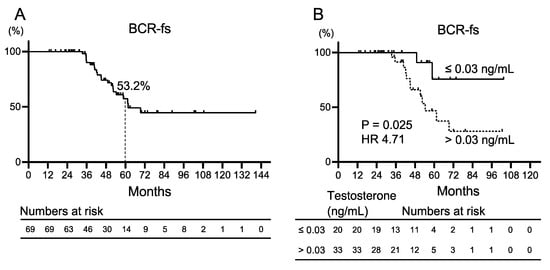 A subgroup analysis of 69 patients who completed initial intermittent ADT was performed to evaluate the characteristics of patients who were not expected to develop BCR after initial salvage ADT intervention (Table 1). The median age was 68 (64–73) years. The median initial PSA was 8.5 (5.6–12.8) ng/mL, with seven patients with biopsy GGG = 5. The median PSA doubling time was 7 (4–11) months. Testosterone levels were measured in 53 patients, with 20 showing testosterone levels ≤ 0.03 ng/mL near the end of initial ADT and 33 patients > 0.03 ng/mL. Only one patient developed CRPC, and none of the deaths in the subgroup were due to prostate cancer. The Kaplan–Meier curves for BCR-fs are shown in Figure 2A. The 5-year BCR-fs rate was 53.2%. Kaplan–Meier curves for BCR after initial ADT divided by a testosterone level of 0.03 ng/mL are shown in Figure 2B. Patients with testosterone levels >0.03 ng/mL demonstrated significantly worse BCR-fs compared with those with ≤0.03 ng/mL (median BCR-fs, 54 months vs. not reached; HR 4.71, 95% CI 1.64–13.53, p = 0.025). Univariate and multivariate analyses were performed to identify factors predicting BCR after initial ADT. In the univariate analysis, a testosterone level ≤ 0.03 ng/mL during ADT was the only factor with a significant difference (HR 4.76, 95% CI 1.06–21.37, p = 0.041; Table 3). In patients undergoing RARP, high GGG, and PSA doubling time (PSA-DT) after primary therapy have been reported to be solid prognostic factors for oncologic outcomes []. Therefore, in this study, we selected GGG, PSA-DT, and testosterone levels for multivariate analysis. The results revealed that a testosterone level ≤ 0.03 ng/mL during ADT was the only factor that predicted recurrence after ADT treatment (HR 5.10, 95% CI 1.10–23.59, p = 0.037; Table 3).