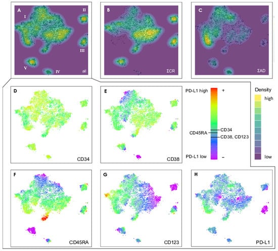 - Amir, E.D.; Davis, K.L.; Tadmor, M.D.; Simonds, E.F.; Levine, J.H.; Bendall, S.C.; Shenfeld, D.K.; Krishnaswamy, S.; Nolan, G.P.; Pe’er, D. viSNE enables visualization of high dimensional single-cell data and reveals phenotypic heterogeneity of leukemia. Nat. Biotechnol. 2013, 31, 545–552. [Google Scholar] [CrossRef]