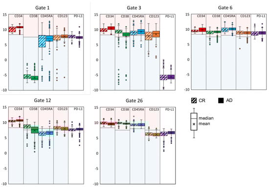 - Kersten, B.; Valkering, M.; Wouters, R.; van Amerongen, R.; Hanekamp, D.; Kwidama, Z.; Valk, P.; Ossenkoppele, G.; Zeijlemaker, W.; Kaspers, G.; et al. CD45RA, a specific marker for leukaemia stem cell sub-populations in acute myeloid leukaemia. Br. J. Haematol. 2016, 173, 219–235. [Google Scholar] [CrossRef] [PubMed]