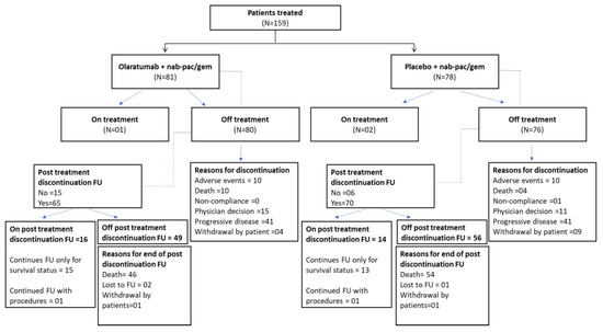 In phase 2, 159 participants were randomly assigned to the olaratumab arm (n = 81) and the placebo arm (n = 78), and at the time of trial closure, of these 159 patients, 156 participants (98.14%) discontinued the study treatment: the olaratumab arm (n = 80, 98.8%) and the placebo arm (n = 76, 97.4%). The major reason for discontinuation was disease progression (Figure 2).