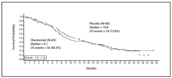 The median OS was 9.1 months in the olaratumab arm and 10.8 months in the placebo arm (Figure 3); the difference was not statistically significant (HR = 1.05; 95% CI: 0.728, 1.527; p = 0.79). The primary objective of the trial was not met.