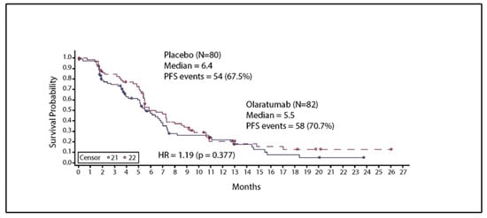 The median PFS was 5.5 months in the olaratumab treatment arm and 6.4 months in the placebo arm (Figure 4). This difference was not statistically significant (HR = 1.19; 95% CI: 0.806, 1.764; p = 0.377).