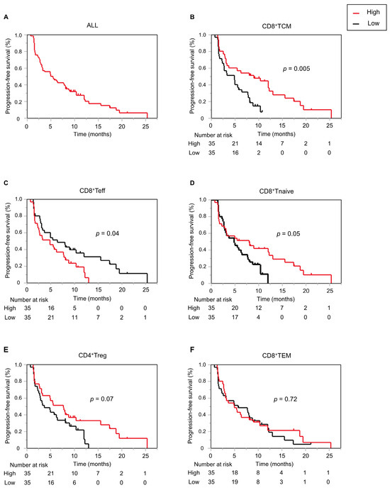 Kaplan–Meier curves representing progression-free survival in all patients (A) and according to baseline CD8+ TCM (B), CD8+ Teff (C), CD8+ Tnaïve (D), CD4+ Treg (E), and CD8+ TEM (F) cell proportions.