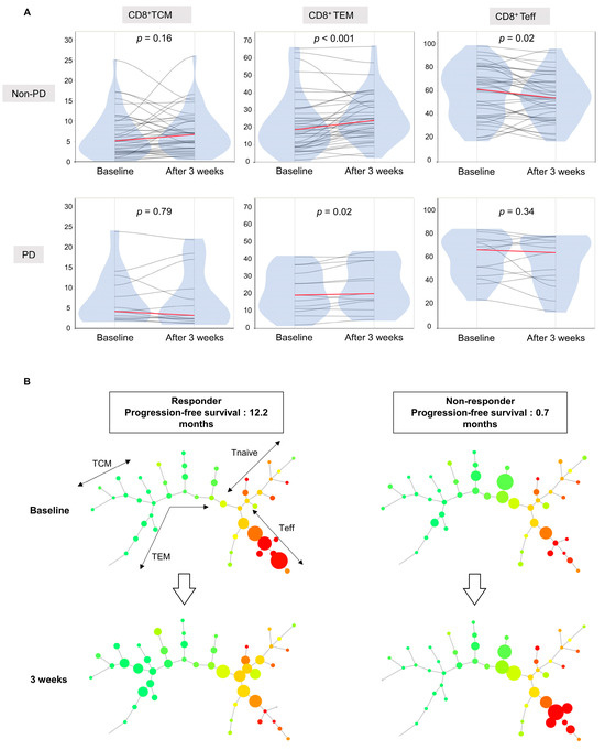 (A) Violin plots representing the changes in peripheral T cell subpopulations of TCM, TEM, and Teff at baseline and 3 weeks after treatment. Each line connects the values before and after treatment in the same patient. p-values were determined by the Wilcoxon signed-rank test. (B) SPADE-generated maturation profiles using CD8 cells extracted by gating in FlowJo software version 10.10.0. Representative figures for treatment responders and non-responders are shown. All samples were down-sampled to 1000 cells to ensure a uniform circle size. CD45RA expression is shown in red/green color scale.