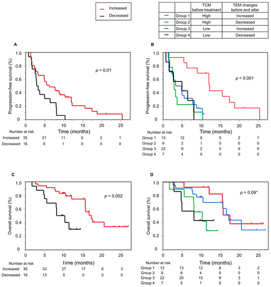 (A) Kaplan–Meier curves presenting progression-free survival (PFS) according to changes in CD8+ TEM cells after treatment. (B) Kaplan–Meier curves presenting PFS according to the combination of baseline TCM and changes in CD8+ TEM proportion after treatment. (C) Kaplan–Meier curves presenting overall survival (OS) according to changes in CD8+ TEM after treatment, and (D) the combination of baseline TCM and changes in CD8+ TEM after treatment. * p-values were calculated by comparing groups 3 and 4.