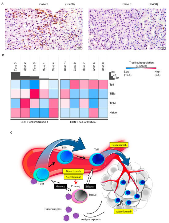 We considered the following three possibilities to explain the observed dynamics in the peripheral T cell subpopulation after treatment: (1) differentiation of CD8+ TCM cells re-exposed to cancer antigens; (2) rescue of exhausted CD8+ T cells and increase in the infiltration of intratumoral CD8+ T cells; and (3) promotion of the T cell priming phase. A possible hypothetical model for the relationship between the dynamics of the peripheral T cell subpopulation and responsiveness to immunotherapy is shown in Figure 5C. We were able to demonstrate that the higher the CD8+ TCM proportion, the higher the number of intratumoral CD8+ T cells tended to be. Zhu et al. reported that patients with a high density of intratumoral CD8+ T cells showed longer OS (HR = 0.29, p = 0.001) and PFS (HR = 0.54, p = 0.053) with Atez/Bev compared to sorafenib [2]. Hence, a greater anti-tumor effect of Atez/Bev can be expected in the group with a high CD8+ TCM proportion. It is possible that CD8+ TCM are re-exposed to cancer antigens released due to the anti-tumor effect of Atez-Bev, which induces their differentiation into CD8+ TEM cells. Antibodies targeting PD-L1 rescue T cells from their exhausted status, and anti-VEGF augments intratumoral T cell infiltration, potentially through vascular normalization and endothelial cell activation [24]. A previous report showed that intra-tumoral CD8+ T cells increased following Atez/Bev treatment [25]. Considering the reports of the inverse relationship between the frequency of Teff cells in circulation and the inflammation signature in non-small cell lung cancer [12] and the relationship between intratumoral CD8+ T cells and peripheral CD8+ Teff in the current study, the decrease in peripheral CD8+ Teff after treatment might be a phenomenon of this positive anti-tumor change. A previous in vivo study showed that the promotion of priming of T cells by CTLA4 blockade predominantly induces a proliferative signature in a subset of transitional memory T cells [26,27,28]. Peripheral memory T population dynamics in Atez/Bev treatment might also reflect the results of promoted priming. Surprisingly, patients with an increased CD8+ TEM proportion tended to have prolonged OS, regardless of their baseline CD8+ TCM proportion. Some studies have shown that tumor-specific TEM responses can remain functional against cancer even in settings of persistent antigen exposure [29]. In tremelimumab plus durvalumab treatment, the promotion of priming by CTLA4 blockade is an important pharmacological effect that significantly improved OS versus that with sorafenib, although PFS was not significantly different in advanced HCC patients [30]. These results suggest that OS might be affected by the function of memory T cells in immunotherapy.