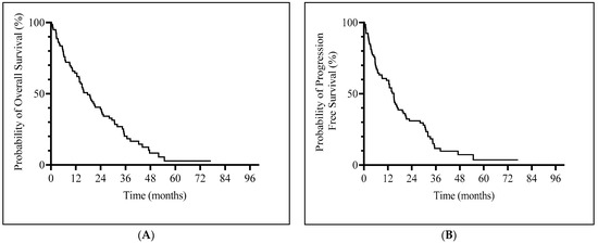 Median OS was 17.6 months (95% CI, 13.56–23.83) (Figure 1A) and median PFS was 14.96 months (95% CI, 9.1–17.1) (Figure 1B). Patients with a hematological response (CR, PR or HI) and SD had a significantly longer median OS (23.8 vs. 5.7 months, p = 0.0005) and PFS (19.8 vs. 3.5 months, p < 0.001) compared to non-responders (Supplementary Figure S1).