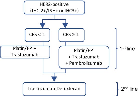 - Thuss-Patience, P.C.; Shah, M.A.; Ohtsu, A.; Van Cutsem, E.; Ajani, J.A.; Castro, H.; Mansoor, W.; Chung, H.C.; Bodoky, G.; Shitara, K.; et al. Trastuzumab Emtansine versus Taxane Use for Previously Treated HER2-Positive Locally Advanced or Metastatic Gastric or Gastro-Oesophageal Junction Adenocarcinoma (GATSBY): An International Randomised, Open-Label, Adaptive, Phase 2/3 Study. Lancet Oncol. 2017, 18, 640–653. [Google Scholar] [CrossRef] [PubMed]