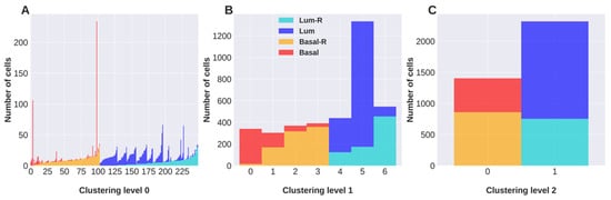 Also, the partition of the lncRNA-based network exhibits three hierarchical levels of cell classification (Figure 2A–C). Similar to the clustering of the mRNA network, level 2 (Figure 2C) classifies cells in two clusters with luminal and basal tumor cells. However, the hierarchical levels 1 and 0 show some differences compared to the classification based on mRNAs. Level 1 (Figure 2B) separates cells into seven clusters, all containing a mixture of resistant and sensitive cells. Level 0 of classification (Figure 2A) separates cells into 249 clusters, many of which include both resistant and sensitive cells.