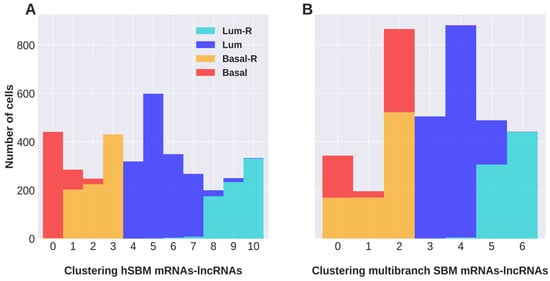 In conclusion, the topic modeling method introduced in this study has demonstrated its efficacy in integrating and clustering protein-coding genes and lncRNA expression in single cells in an unsupervised manner. Multibranch SBM allows for the classification of breast cancer cell populations, indicating that mRNA and lncRNA datasets offer complementary insights into tumor heterogeneity when treated as separate omics layers.
