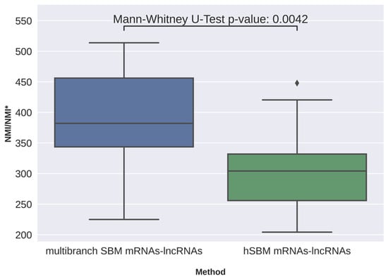 The NMI/NMI* score of clustering level 1 (hSBM-mRNAs-lncRNAs) obtained for the hSBM applied to the concatenated matrices was lower than the one obtained for mRNAs and lncRNAs analyzed as disjoint omics layers (multibranch SBM mRNAs-lncRNAs) (Table 1). In the clustering obtained with the multibranch SBM algorithm, the NMI/NMI* score clearly improves compared to all previous experiments (Table 1), showing that mRNA and lncRNA matrices treated as disjoint omics layers provide more relevant information about tumor heterogeneity. The performances of the multipartite approach are not the best in level 0 and level 2 of the hierarchy. However, from all four experiments, these partitions show either a very rough clustering of the cells (level 2 always shows two clusters, the basal-like and luminal-like cells) or an extremely fine clustering with hundreds of groups, each one containing very few cells, the biological meaning of which is questionable. The difference between the tripartite experiment and the others was not very large, but we checked whether the tripartite approach leads to systematically better results than the bipartite approach. We ran each experiment (hSBM-mRNAs-lncRNAs and multibranch SBM-mRNAs-lncRNAs) multiple times, measuring the NMI/NMI* score. Each experiment was run 20 times and we excluded the runs with performances out of the 0.05 and 0.95 quantile in order to remove outcomes with highly unlikely scores. The results of the multiple runs show that multibranch SBM is statistically significantly better than the bipartite approach (Figure 4). Despite a slight increase in the NMI/NMI* fold change, the improvement in the classification measured with the NMI/NMI* score on multiple runs is systematically slightly better for the multibranch algorithm.
