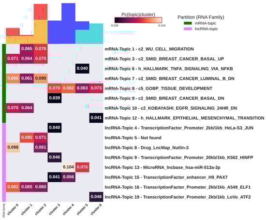 The results show a clear enrichment of all but one topic to the pathways involved in the subtyping and progression of breast cancer and to sets of lncRNA that are interactors of transcription factors involved in cancer. Notably, we found topics specifically associated with luminal or basal cell clusters, with no topics associated with both luminal and basal types. As an example, mRNA-Topic 3 shows the keyword SMID_BREAST_CANCER_BASAL_UP [34] and is enriched only in basal-related clusters. The same happens for mRNA-Topic 7 which, being also composed of basal cells, shows a keyword related to luminal downregulation. All mRNA-Topics and lncRNA-Topics are associated with clusters of a specific tumor type and can be used in an unsupervised framework to identify the tumor type.