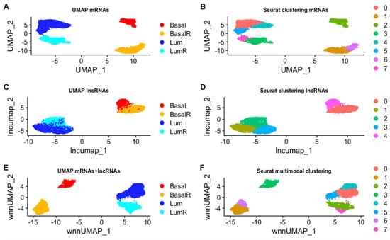 UMAPs representing the clustering obtained with Seurat using mRNA expression alone (A,B), lncRNA expression alone (C,D), and using both modalities (E,F). On the left is shown the tumor of origin of the cells in the UMAP and on the right the clusters obtained with Seurat. (A,E) are extremely similar, showing the irrelevant change when the lncRNA expression is taken into account.