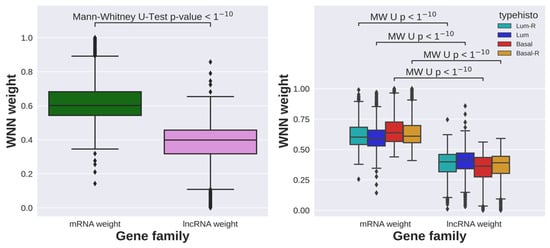 The boxplots plots show the weights assigned by Seurat WNN to the mRNAs and lncRNAs for all cells (left panel) and for cells grouped by tumor of origin (right panel). p-values are obtained with Mann–Whitney U-test.