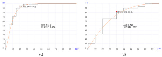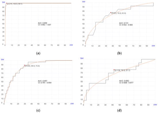 Receiver operator characteristics (ROC) curves for predicting aGvHD in pre- and post-transplant patient cohorts. (a) Post-transplant aGvHD prediction using 92 genes (AUC = 0.999, p = 0.03) in the training set. (b) Post-transplant aGvHD prediction (AUC = 0.721, p = 0.03) in the validation set. (c) Pre-transplant aGvHD prediction using 400 genes (AUC = 0.857, p = 0.02) in the training set. (d) Pre-transplant aGvHD prediction using (AUC = 0.692, p = 0.02) in the validation set.