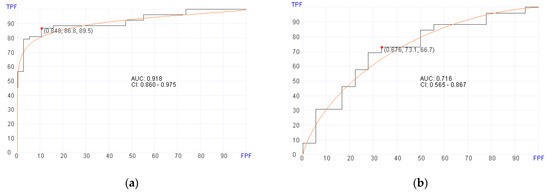 Of the 119 patients with post-transplant BM samples available, 87 were alive at a median follow up of 14 months at the time of data analysis. Using post-transplant BM RNA data, the machine learning algorithm selected 20 genes (Table 3) for predicting OS in the training set with an AUC of 0.918 (95% CI, 0.860–0.975; p = 0.02), 86.8% sensitivity, and 89.5% specificity (Figure 2a). In the validation set, the machine learning algorithm showed an AUC of 0.716 (95% CI, 0.565–0.867; p = 0.02), 73.1% sensitivity, and 66.7% specificity using a cut-off score at 0.676 (Figure 2b). The genes that are selected by the algorithm for predicting survival included genes involved in MAPK signaling pathway and chemokine signaling.