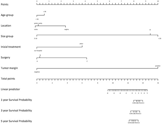 Nomogram on DFS according to initial treatment site (A), surgery procedure (B) and tumor location (C).