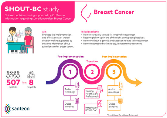 - Hackert, M.Q.N.; Ankersmid, J.W.; Engels, N.; Prick, J.C.M.; Teerenstra, S.; Siesling, S.; Drossaert, C.H.C.; Strobbe, L.J.A.; van Riet, Y.E.A.; van den Dorpel, R.M.A.; et al. Effectiveness and implementation of SHared decision-making supported by OUTcome information among patients with breast cancer, stroke and advanced kidney disease: SHOUT study protocol of multiple interrupted time series. BMJ Open 2022, 12, e055324. [Google Scholar] [CrossRef]