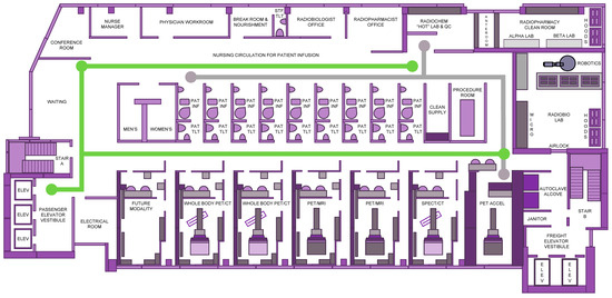 Theranostic cancer center floor plan. Illustrated are the elements of a theranostic cancer center floor plan with integrated patient and radiopharmaceutical spaces. The green path marks the pathways of patient travel through the center. Dedicated patient entry leads to a chic retail-like waiting room with check in kiosks and patient education materials. A small offset conference room allows for patient consultation or for morning staff-wide huddle. Informal nursing circulation with work kiosks flank nine patients appropriately shielded in radiopharmaceutical incubation/infusion rooms each with a dedicated bathroom. A patient minor procedure room rounds out the hallway. A nurse manager charged with an additional patient navigation role has prime office space, with physician workroom, staff break room, and radiobiologist office, as well as radiopharmacist office line the perimeter. A radiopharmacy engaged in the sterile and nonsterile handling of radioactive drugs has an anteroom, negative-pressure clean room with appropriate air quality, alpha and beta emission workspaces as well as lead-lined biologic safety cabinets. The gray path outlines radiopharmaceutical traffic as directed by the radiopharmacy. A robotic self-driven radiobiology laboratory, with a negative-pressure clean room and appropriate air quality, contains an immunohistochemical microscopy facility and complimentary high-performance liquid chromatography as well as liquid chromatography with tandem mass spectrometry. A biology-guided radiotherapy accelerator offers PET tracer-based localization and treatment of patient tumor. Two whole-body PET/CT, two PET/MRI and one SPECT/CT scanners provide diagnostic or dosimetry activity and evaluate radiopharmaceutical treatment effect.