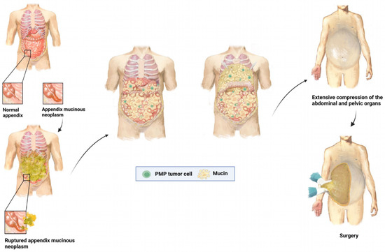 Pseudomyxoma peritonei (PMP) is an internationally recognized rare disease with an incidence of 2–4 per million [1,2,3]; the incidence is higher in females, approximately 2–3 times that of males [4,5,6]. It is often caused by the rupture of a mucinous tumor originating from the appendix, followed by massive colonization of tumor cells in the peritoneal cavity and continued production of mucus. Cases of PMP caused by mucinous tumors originating from organs such as the ovaries, colon, pancreas, and urachus have also been reported [7,8,9,10] (Figure 1). Although the manifestations of intra-abdominal mucinous tumor tissue may vary among different patients (Figure 2), under the premise of non-surgical intervention, such patients will suffer from progressive intestinal obstruction and nutritional deficiencies caused by progressive mucus compression, eventually developing cachexia, which leads to death.