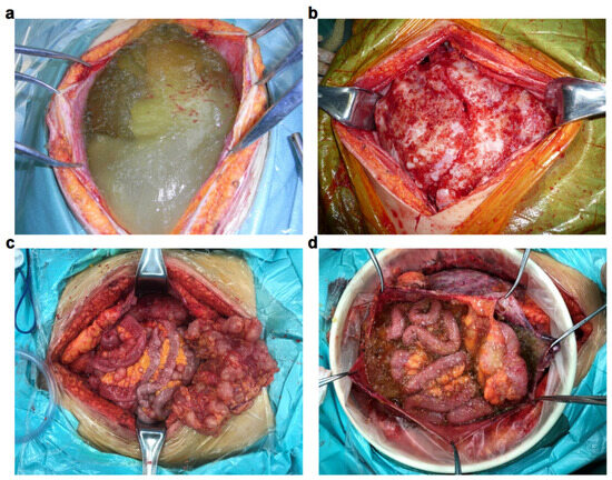 - Delhorme, J.B.; Elias, D.; Varatharajah, S.; Benhaim, L.; Dumont, F.; Honore, C.; Goere, D. Can a Benefit be Expected from Surgical Debulking of Unresectable Pseudomyxoma Peritonei? Ann. Surg. Oncol. 2016, 23, 1618–1624. [Google Scholar] [CrossRef] [PubMed]