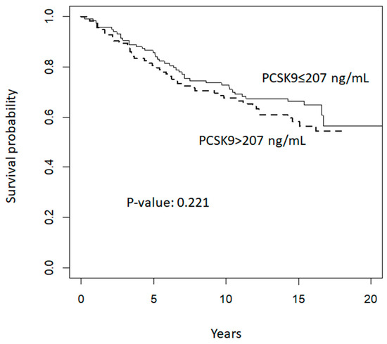 When exploring the prognostic value of circulating plasma levels of PCSK9 on breast neoplastic events during follow up, we did not find any significant association between PCSK9 and disease-free survival. Kaplan–Meier curves according to median baseline PCSK9 plasma levels (i.e., below or equal to 207 ng/mL versus above 207 ng/mL) are presented in Figure 2. The median follow-up period was 17 years and the analysis included 77 breast neoplastic events (29 premalignant lesions and 48 invasive breast cancer lesions), and one sarcoma in the breast. Furthermore, we reported 11 events of other cancer types. The hazard ratio of events for women with PCSK9 plasma levels above 207 ng/mL, adjusted for risk strata, age, and treatment arm allocation (tamoxifen plus placebo; fenretinide plus placebo; tamoxifen plus fenretinide; placebo plus placebo) compared to women with levels equal to or below 207 ng/mL was 1.002 (95% confidence interval: 0.999–1.005, p = 0.22).