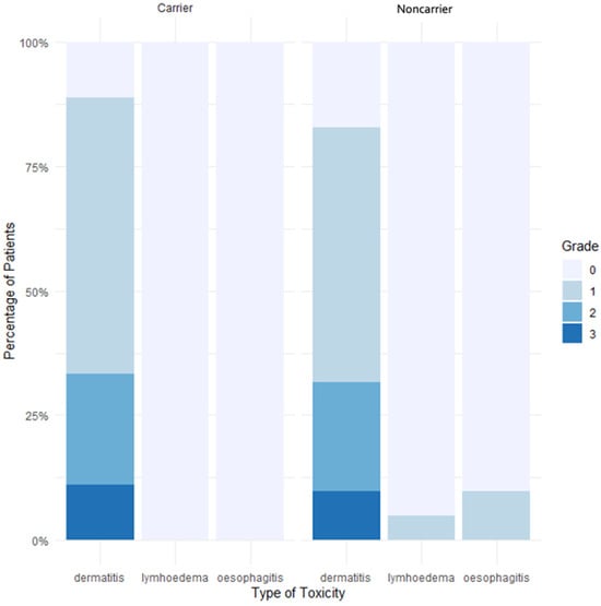 When focusing on the 16 patients carrying either a rare monoallelic PV or predicted PV and/or the minor allele A of SNP rs1801516, the main acute toxicity was dermatitis, impacting 75% of women, representing twelve women above this subgroup. Regarding acute toxicities, no significant difference was observed between the carriers of a rare monoallelic PV or predicted PV ATM carriers and carriers of the minor allele A of SNP rs1801516 as compared to noncarriers (dermatitis: p = 0.65/ dysphagia: p = 1/ lymphoedema: p = 1) (Figure S2).