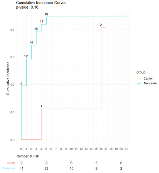 Incidence curve of late subcutaneous fibrosis in carriers and noncarriers of a rare ATM PV or predicted PV. Abbreviations: Carrier: patients with a rare ATM Pathogenic variant (PV) or predicted PV, Noncarrier: patients with no rare ATM PV or predicted PV.