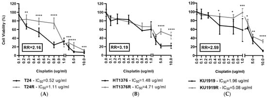 - Skowron, M.A.; Melnikova, M.; van Roermund, J.G.H.; Romano, A.; Albers, P.; Thomale, J.; Schulz, W.A.; Niegisch, G.; Hoffmann, M.J. Multifaceted Mechanisms of Cisplatin Resistance in Long-Term Treated Urothelial Carcinoma Cell Lines. Int. J. Mol. Sci. 2018, 19, 590. [Google Scholar] [CrossRef]