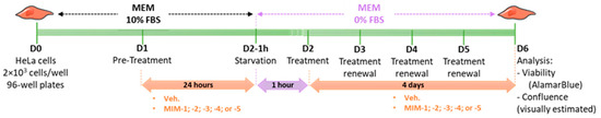 Representative scheme of the experimental protocol. Briefly, 2 × 103 cells/well were seeded in a 96-well plate in minimum essential medium (MEM) containing 10% fetal bovine serum (FBS) on Day 0 (D0). The cells were then pre-treated for 24 h with either the vehicle (Veh.), micro-immunotherapy medicine (MIM)-1, -2, -3, -4 or -5- in 10% FBS, and starved for one hour in serum-free MEM on D2. After this step, the treatments were re-added to the medium and renewed every 24 h over the next 4 days. The cells were kept in a serum-free medium during the entire treatment duration. On D6, the cell viability was assessed by AlamarBlue reagent, and the confluence was visually estimated by microscopy. FBS: fetal bovine serum; MEM: minimum essential medium.