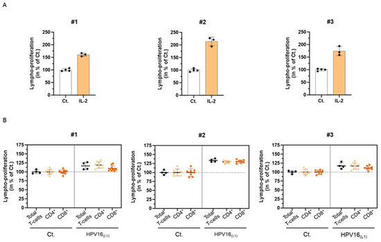 Influence of the L1-protein capsid of HPV 16 (HPV16(L1)) on the proliferation of human peripheral blood mononuclear cells (PBMCs) isolated from three women donors (#1–#3). (A) Lympho-proliferation in the untreated control condition (Ct.) and in the 20 ng/mL IL-2-treated condition for each of the assessed donors. Data are illustrated as the mean percentages ± standard deviation (S.D.) of the lympho-proliferation for n = 4 replicates for the Ct., and n = 3 replicates for the IL-2 conditions, obtained for each donor, the untreated Ct. condition being set as 100%. (B) Lympho-proliferation in the untreated control condition (Ct.) and in the HPV16(L1) (1/400 v/v)-treated condition for each of the assessed donors. The proliferation of the total T-cells (black dots), CD4+ T-cells (light orange dots), and CD8+ T-cells (dark orange dots) was appraised. The data are presented as the mean percentage ± S.D. of the total cells counted after an incubation of 5 days; the Ct. condition being set at 100%. Each dot represents a technical replicate, and the dotted lines in (B) are drawn to highlight the effect of HPV16(L1) in comparison with the untreated Ct.