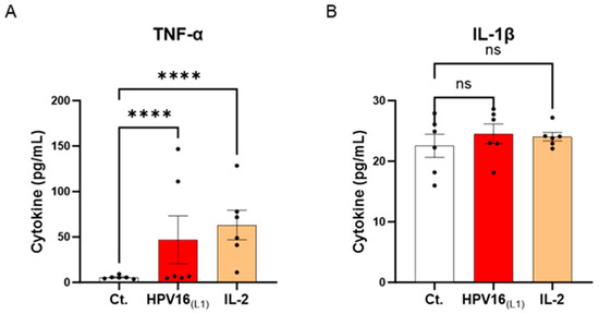 Effect of HPV16(L1) and IL-2 treatments on the secretion of cytokines involved in the anti-viral response in human peripheral blood mononuclear cells (PBMCs). The secretion of (A) TNF-α and (B) IL-1β has been assessed by enzyme-linked immunosorbent assay (ELISA). The secretion levels of these cytokines have been assessed in the control condition (Ct.; white histograms) or after treatment with either HPV16(L1) peptide pool (1/450 v/v; red histograms), or 20 ng/mL of IL-2 (orange histograms), within the supernatants (SNs) recovered from PBMCs isolated from women donors. Data are illustrated as the mean concentrations (in pg/mL) ± S.E.M. obtained for n = 6 donors in each treatment condition. Two-way ANOVA: **** p < 0.0001, ns: non-significant.