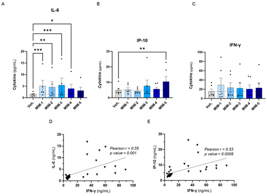 To evaluate the effects of the five capsules of 2LPAPI on the cytokine secretion in our in vitro model of HPV16(L1)-treated PBMCs, we wanted to focus on cytokines involved in anti-viral immune responses; thus, the same panel as in Section 3.2. was assessed (IL-6, IP-10, IFN-γ, IL-1β, TNF-α, IFN-α2, IFN-γ1, IL-12p70, and GM-CSF). The effects of 2LPAPI on those cytokines are depicted in Figure 4 and Supplementary Figure S3, as the mean pg/mL ± standard error of the mean (S.E.M.) of the secretion obtained in each condition, for n = 6 donors. Interestingly, it can be observed that 4 out of the 5 tested capsules of 2LPAPI significantly increased the secretion of IL-6 (Figure 4A). The effects on IP-10 secretion have a different pattern: while MIM-1, MIM-2, and MIM-4 have barely affected IP-10 secretion, MIM-3 and MIM-5 have induced an increased secretion of this factor, even reaching statistical significance for MIM-5 (Figure 4B). All the capsules of 2LPAPI slightly increased the secretion of IFN-γ in a non-significant manner (Figure 4C). MIM-1 seemed to have the most IFN-γ-inducing effect, while the magnitude of the effects appeared quite similar for the 5 capsules as the means ranged from about 20 to 30 pg/mL in MIM-treated cells compared to the Veh.-treated (in which the mean is about 15 pg/mL). Of note, no major change in the secretion levels of IL-1β, TNF-α, IFN-α2, IFN-γ1, IL-12p70, and GM-CSF was noticed as a consequence of treatment with 2LPAPI capsules in the experimental conditions tested here. Interestingly, positive correlations between the levels of IL-6 and IFN-γ (r = 0.55, p = 0.001, Figure 4D), and between IP-10 and IFN-γ concentrations (r = 0.53, p = 0.0008, Figure 4E) were found amongst samples.
