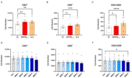 Effect of 2LPAPI on the proliferation of HPV16(L1)-treated peripheral blood mononuclear cells (PBMCs) from women. (A–C) Lympho-proliferation in the untreated control condition (Ct.; white histogram), in the HPV16(L1) (1/450 [v/v])-treated condition (red histogram), and in the 20 ng/mL IL-2-stimulated condition (orange histogram), within the sub-populations of CD4+, CD8+, and CD4−/CD8− T-cells, respectively. Data are illustrated as the mean cell number ± S.E.M. obtained for n = 6 donors in each treatment condition. (D–F) Lympho-proliferation after treatment with either the vehicle (Veh.), MIM-1; -2; -3; -4 or -5, in the presence of HPV16(L1) (1/450 [v/v]), within the same sub-populations as in (A–C). Data are illustrated as the mean cell number ± S.E.M. obtained for n = 6 donors in each treatment condition. Each dot represents the mean value of the data collected from n = 2 replicate per donor. Two-way ANOVA: **** p < 0.0001, *** p < 0.001, ** p < 0.01, * p < 0.05, ns: non-significant. The dotted lines in (D–F) are drawn to highlight the effect of each treatment in comparison with the Veh. condition.