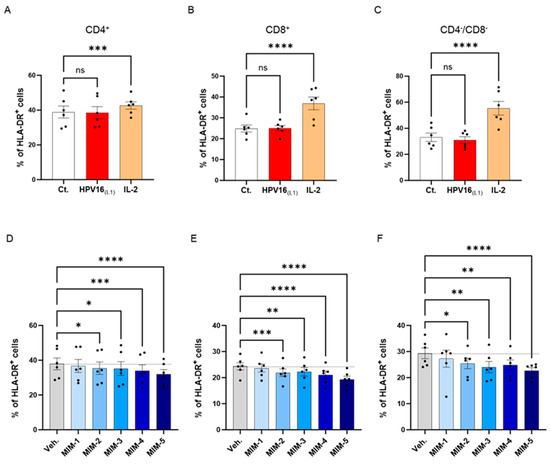 To investigate the possible effects of 2LPAPI on the activation status of HPV16(L1)-treated PBMCs, we assessed the expression of HLA-DR. It is worth noting that the 2LPAPI contains the specific nucleic acid (SNA)-HLA-II component at ultra-low dose (ULD), which has already been demonstrated to reduce the expression of HLA-DR in IFN-γ-stimulated HUVEC cells [40,41]. Therefore, evaluating the impact of 2LPAPI on HLA-DR expression in PBMCs treated with HPV16(L1) peptide can provide valuable insights into its potential effectiveness in managing inflammation induced by HPV, as well as further validate its inhibitory effect on HLA-DR. Thus, in the same experimental setting as presented in Section 3.2, Section 3.3 and Section 3.4, the expression of HLA-DR was assessed by flow cytometry in the sub-populations of CD4+, CD8+, and CD4−/CD8− T-cells. The results are presented in Figure 6, as the mean percentage ± S.E.M of positive cells for HLA-DR in each Ct., HPV16(L1), IL-2-treatment condition and in the Veh.-/MIM-treatment condition. As illustrated in Figure 6A–C, while IL-2 induced a significant increase in the HLA-DR expression of the three T-cell sub-populations, HPV16(L1) did not impact the expression of this marker. However, it appeared that in the three analyzed subsets of T-cells, capsules MIM-2 to MIM-5 significantly reduced the expression of this marker when compared with the Veh. (Figure 6D–F). Of note, MIM-5 seemed to be the capsule that induced the most powerful effect.