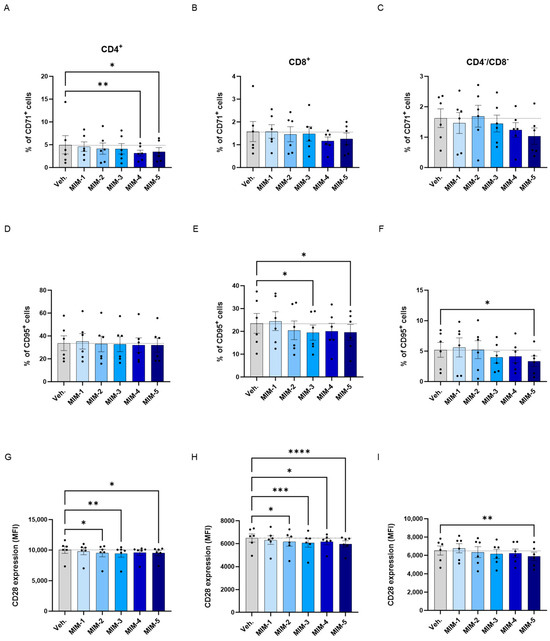 Overall, regarding the expression of CD71, it appeared that in the three analyzed subsets of T-cells, the tested capsules reduced the expression of this marker, except MIM-2, in the CD4−/CD8− cells, when compared with the Veh. (Figure 7A–C). Of note, MIM-4 and MIM-5 seemed to be the capsules that induced the most powerful effect in reducing the percentage of CD4+/CD71+ cells, reaching statistical significance in this population.