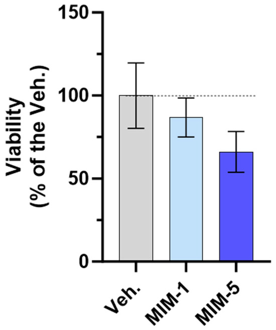 MIM-1 and MIM-5 lowered the cellular viability/proliferative potential in a model of starved HPV-positive cervical cancer cells. Cell viability/proliferative potential of HeLa cells was assessed via AlamarBlue reagent under the experimental conditions presented in Section 2.3 (see Figure 1) when treated with the vehicle (Veh.), MIM-1 or MIM-5. The results are presented as the mean percentages ± standard deviation (S.D.) of n = 6 replicates per condition, with the Veh. being set at 100%.
