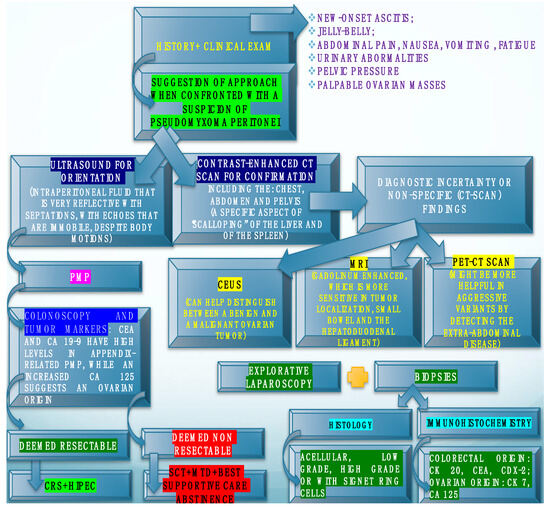 In order to conduct a preoperative diagnosis, we consider that a patient with PMP would benefit from the following: a contrast-enhanced CT scan of the abdomen and the pelvis; this is because apart from reporting the radiological findings, it can also predict the likelihood of complete cytoreduction. Moreover, tumor markers, such as CEA, CA125, and Ca 19-9 can orient the clinician regarding the origin of the PMP. Furthermore, to increase the precision, if the operation is not imminent, as can occur in the case of a surgical emergency, then of course the panel of investigations can be completed using the following: abdominal ultrasound, colonoscopy, biopsy, blood tests, MRI scan, or even PET-CT.
