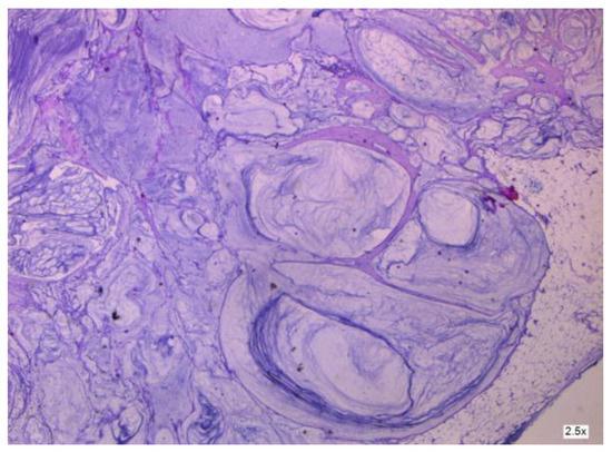 As shown by Yan [4], ovarian-derived PMP is very uncommon. To obtain an accurate diagnosis, it is necessary to examine consecutive sections of the appendix or suspicious tissue to rule out appendiceal mucinous neoplasms (see Figure 8 and Figure 9). This involves analyzing clinical aspects, surgical findings, histological characteristics, and particular biomarkers using immunohistochemistry. More so, as described by Fu [36], the histopathologic subtype and peritoneal cancer index (PCI) may be used as prognostic indicators in patients with mucinous ovarian carcinoma (MOC)-derived pseudomyxoma peritonei (PMP). Patients with advanced-stage illness (see Figure 10 and Figure 11) may benefit from achieving complete cytoreduction (CCR) 0/1.