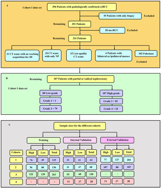 (A) Diagrammatic representation of the exclusion and inclusion criteria for the cohort 1 data set. 45 patients with only biopsy and 20 with mccRCC were excluded. (B) Distribution of sample sizes in cohort 1, categorised by low- and high-grade. There was 80 and 107 low- and high-grade tumours respectively. (C) Sample sizes for the various cohorts utilised in this study. The training, internal and external validation samples for each of the four cohorts are highlighted.