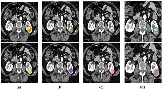 The patients in cohort 1 were examined using up to five different CT helical/spiral scanners, including GE Medical Systems, Philips, Siemens, Canon Medical Systems, and Toshiba 512-row detectors. The detectors were also of different models, including Aquilion, Biograph128, Aquilion Lightning, Revolution EVO, Discovery MI, Ingenuity CT, LightSpeed VCT, Brilliance 64, Aquilion PRIME, Aquilion Prime SP, and Brilliance 16P. The slice thicknesses were 1.50, 0.63, 2.00, 1.25, and 1.00 mm. Likewise, the number of pixels in the image was 512 × 512. The arterial phase of the CT scan obtained 20–45 s after contrast injection was acquired using the following method: intravenous Omnipaque 300 contrast agent (80–100 mL/s), 3 mL/s contrast injection for the renal scan, and 100–120 kVp with an X-ray tube current of 100–560 mA depending on the size of the patient. For the UMHC data set, refer to [29,30].