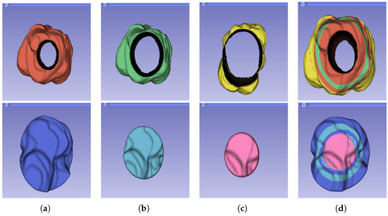 Representation of the 3D segmented regions: (a) 75% periphery (red) and core (blue) of the tumour; (b) 50% periphery (green) and core (blue) of the tumour; (c) 25% periphery (yellow) and core (pink) of the tumour; and (d) overlap of the periphery and core sub-regions.