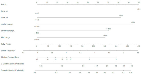 In the D cohort, a total of 22 variables were analysed in the UVA. Of these, 15 variables were included in the MVA, and were optimally dichotomised with maximally selected rank statistics. Using MVA and LASSO analysis, five variables were retained as most significant (p < 0.05) and were used for the development of the U-IPI index (baseline NLR, baseline PLR, neutrophil change at 4 weeks, albumin change at 4 weeks, LDH change at 4 weeks). These variables were used to build the U-IPI nomogram for the prediction of survival outcomes for patients. Individual component scores are added to obtain the final score, which ranges from 0 to 413. The nomogram is able to predict mOS and survival probabilities at 3 and 6 months for platinum-refractory a/mUC patients receiving ICI treatment (Figure 1).
