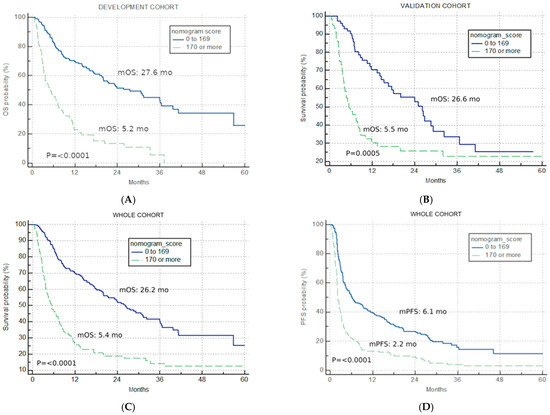 The best total points cut-off was defined at 170 with the use of maximally selected rank statistics, separating the development cohort into good-risk (<170 points) and poor-risk (>170 points) U-IPI categories (Figure 2A), with an mOS of 27.6 months vs. 5.2 months, respectively (p < 0.0001, HR for the good-risk category: 0.1833; 95% CI: 0.1226; 0.2739).