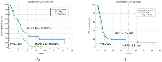 Univariate analysis chemotherapy cohort. Kaplan–Meier curves for nomogram score cut-off for two risk categories (good risk < 170, poor risk > 170) (A) overall survival chemotherapy cohort; (B) progression-free survival for chemotherapy cohort.
