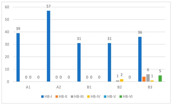 Preoperative facial nerve paresis was evident in 14 class A and B tumors ranging from HB-II to HB-IV. In contrast, 5 class B3 patients had complete facial nerve paralysis (HB-VI) at presentation. Intraoperative facial nerve status includes either simple erosion of the fallopian canal (n = 12) or gross tumor infiltration (n = 10). All patients who had gross facial nerve infiltration had facial nerve paresis/paralysis at the initial presentation. The most common site of facial nerve involvement was the tympanic segment, followed by the second genu, mastoid segment, and geniculate ganglion. In patients with gross infiltration, a segment of the involved facial nerve was removed, and reconstruction was performed. Only one case underwent a sural nerve graft, whereas primary end-to-end anastomosis was performed in the rest of the cases, with excellent outcomes at one-year follow-up. Postoperatively, facial nerve deficit was apparent only in class B2 and B3 tumors (Figure 9), and this finding has a strong correlation with preoperative facial nerve function as well as intraoperative findings (p < 0.05).